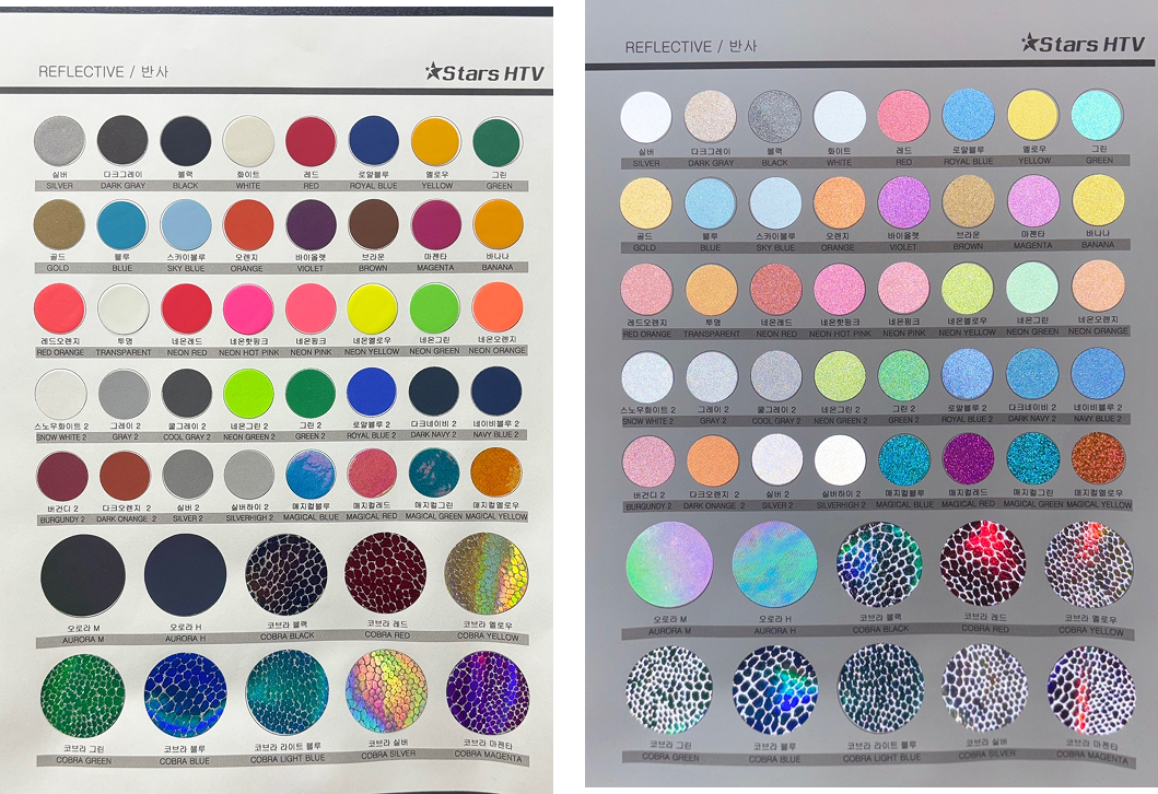 빛을 받으면 *강하게 반사되는 특수 입자*가 표면에 코팅된 열전사 필름입니다.